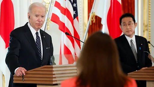 拜登在东京与日本首相岸田文雄举行的新闻发布会上回答问题时,有记者问及台湾防务问题。