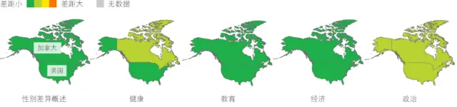 美国在女性政治参与方面位居加拿大之后,但在健康和经济生活方面领先邻国,两国在教育方面的指数持平。