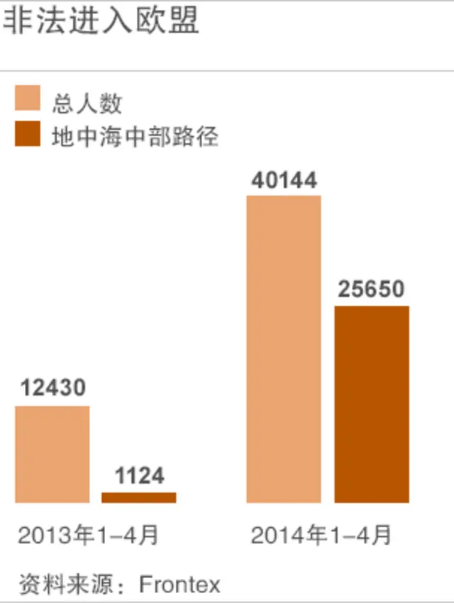 欧盟边防局说,横越地中海到意大利的非法移民人数急剧的增加,今年1到4月被侦测到的非法移民人数就有42000人,其中25650人来自利比亚。