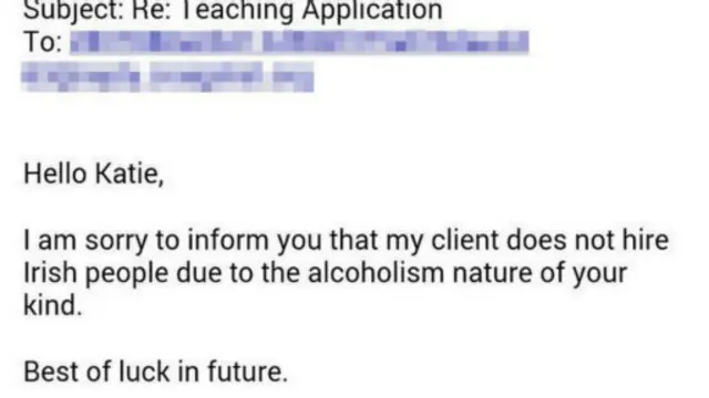 上个星期,她接到回复:“很抱歉通知您,我们的客户不想雇佣爱尔兰人,因为你们这类人嗜酒成性。”