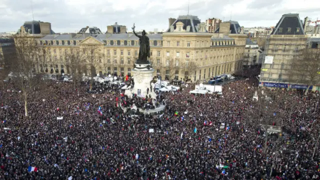 巴黎市中心共和国广场附近的街道成为人的海洋。为保障游行安全,法国政府部署了数以千计的警察、军人和特种部队狙击手。