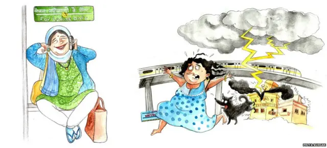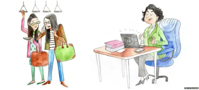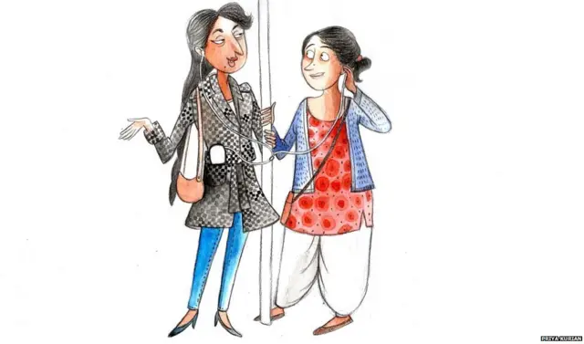 BBC印地语记者莎鲁·亚达夫在伦敦住了一年,印象最深的一点是上下班时间伦敦地铁上很少有人说话。而在她的家乡印度德里地铁专门给妇女准备的车厢里,女乘客会毫不掩饰的与同伴,甚至有时同陌生人分享她们的经历。下面是莎鲁在车厢中听到的神聊。文中漫画的作者是普里亚·库瑞岩。