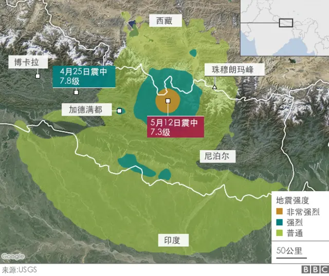 尼泊尔在4月25日刚经历了一次7.8级强烈地震,8,046人在地震中死去,17,800多人受伤。