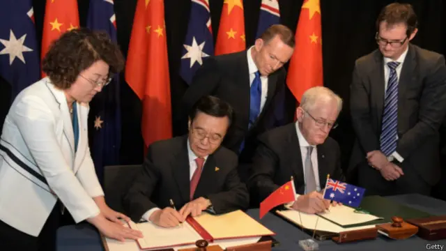中国与澳大利亚两国周三(17日)在堪培拉的国家美术馆正式签署双边自由贸易协定。这也是继韩国之后,中国与亚太地区国家签署的另一个重要自贸协议。