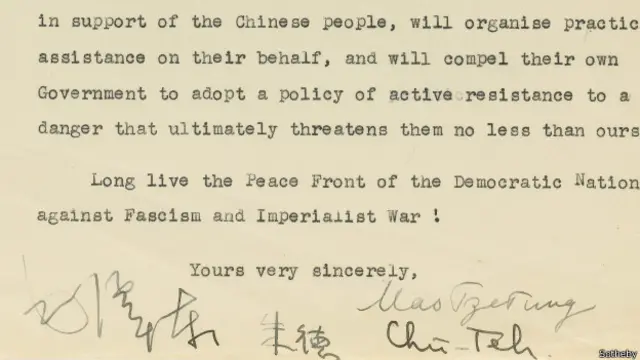 这封有毛泽东和八路军总司令朱德签名的信写道:“我们以中国共产党的名义,并代表正在与侵略者进行殊死较量的全体中国人民,向英国人民和您所领导的英国工党送上良好的祝愿。”