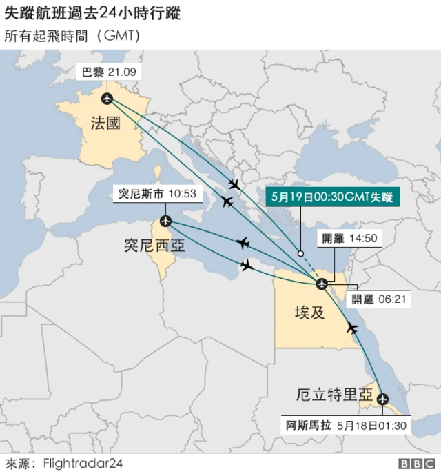 埃及航空表示,航班上有56名乘客和10名机组人员。这架埃及航班是在进入埃及空域16公里处的地中海上空失联的。