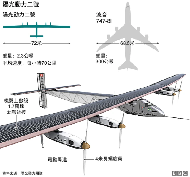 “阳光动力二号”的能源全部来自于太阳能,机身上共有1.7万块光伏电池,这些电池在白天为飞机提供动力,同时在夜间为飞机引擎充电。