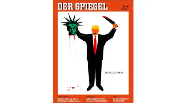 - 《明鏡》封面圖像正是特朗普想要的-他的扭曲的形像,正好讓他用來扭曲媒體的形像。特朗普跟恐怖主義分子之間不能這樣簡單地劃等號。
