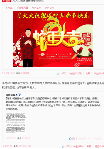 2月12日發出的新貼子似乎是在評論朝鮮剛剛進行的核試驗:「半島和平需要各方努力,無核家園是人類的終極目標,在適者生存的規則下,發展硬拳頭是否能拯救自己,也不會影響他人。」