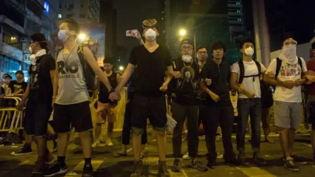 香港《明報》報道,凌晨4點,在旺角新填地街與亞皆老街交界地區,示威人士與警方對峙,警方一度舉起警告的黃牌並多次施放胡椒噴霧,驅趕示威者。