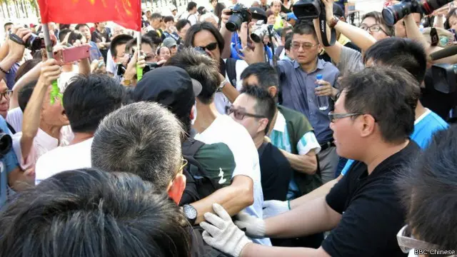 而在維多利亞公園內,支聯會舉行時政論壇,有「本土派」示威者上前喊話,指責支聯會出賣香港。支聯會義工勸離時雙方推撞扭打,警察到場調停。