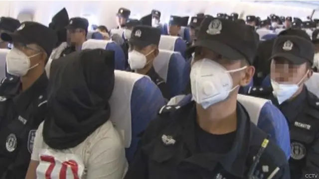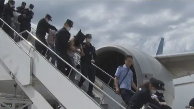 中國中央電視台周六播出的新聞畫面顯示,偷渡者被警方押送乘搭飛機遣返回中國時,全部都被蒙頭扣押。