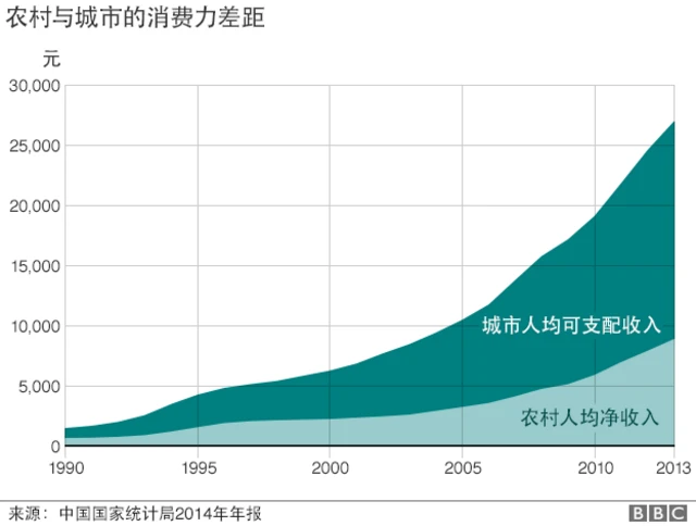 儘管人均收入增多,但不是人人獲利,1990年以來,城市和農村的人均可支配收入差距拉大。