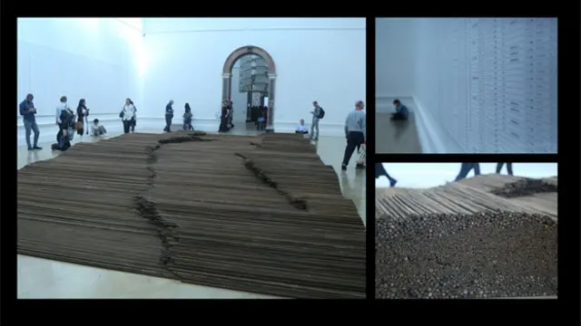 策展方在簡介中稱,這個作品不僅是那場災難的紀念碑,更是一個活的見證。粗細不一的鋼筋,是20幾所坍塌學校建設質量的證據和質疑。