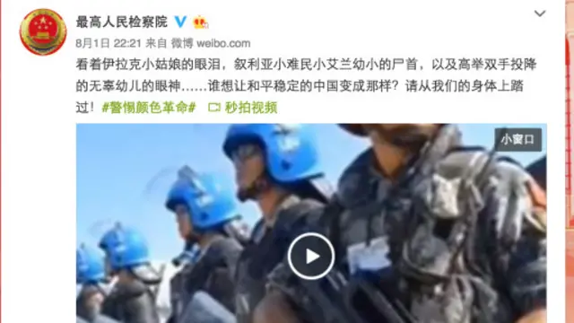 這些官方微博在8月1日晚大致相同時間發佈同樣一條視頻,內容針對一系列「分裂勢力」,並在解說詞中表示,「誰想讓和平穩定的中國變成那樣,請從我們的身體上踏過」。