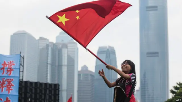 示威人群揮舞中國國旗、高呼反對香港獨立的口號。