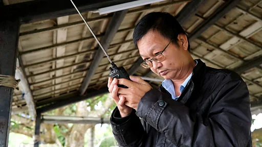 許先生用塑料束帶將一根長天線綁在一條鐵欄上,然後坐下來用他的手提收音機搜索軍用電台頻道。一開始,我們只聽到台灣海巡隊的柔和南台灣口音指揮著海上交通。然後,透過濃重的靜電干擾,傳來了不同口音和語氣。那是中國海軍。