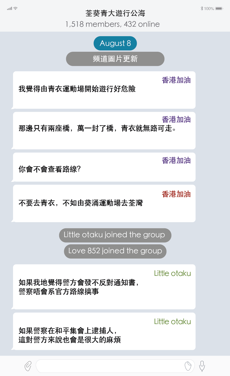 正是在Telegram上,來自葵涌和荃灣的十幾名陌生人在六月份互相結識,他們組織了8月25日的抗議示威。
