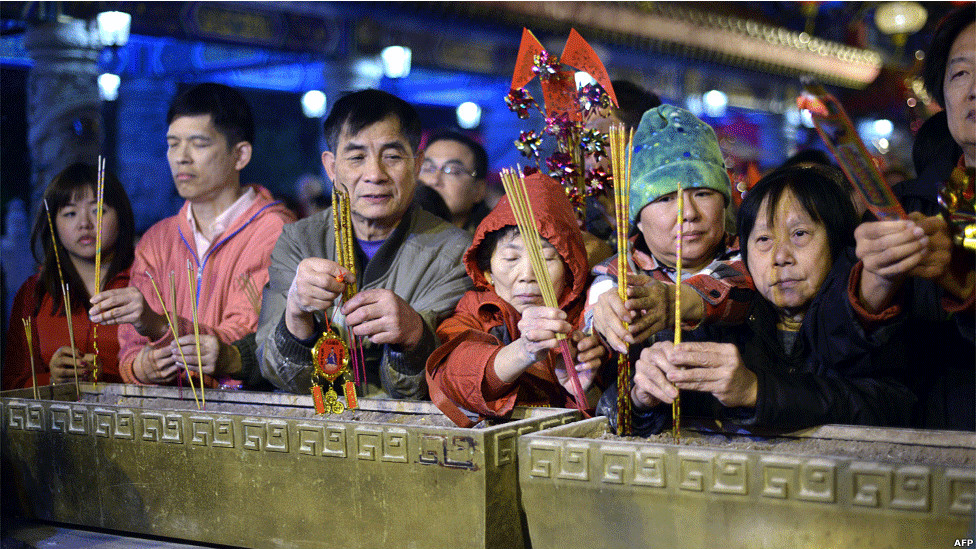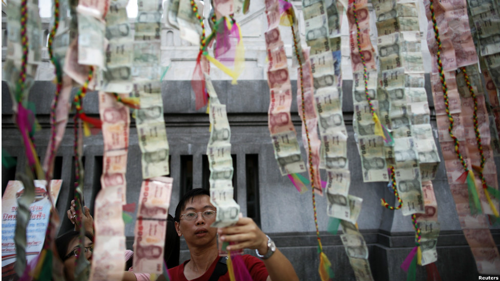 在泰國首都曼谷的唐人街,人們掛起泰銖紙幣祈福。