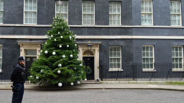 英國首相官邸唐寧街10號擺設巨大聖誕樹。