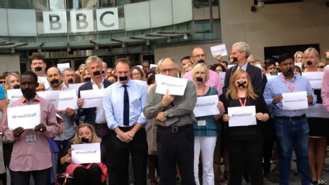 今年4月,數百名BBC新聞部員工也曾經舉行集會,聲援已被囚禁並等待審訊的三名半島電視台記者。