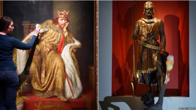 展品包括英王約翰的牙齒和拇指骨、當時的肯特伯雷大主教(Archbishop of Canterbury)沃爾特的衣服和牧杖,有800年歷史。查爾斯·布查爾(Charles Buchel)在1900年繪畫莎士比亞名著《約翰王》中的英王約翰造型(上左圖),模特是赫伯特·比爾博姆·特裏(Herbert Beerbohm Tree),倫敦維多利亞與阿爾伯特博物館(Victoria & Albert Museum)借出。當年其中一位貴族傑弗裏·特·曼德維爾(Geoffrey de Mandeville)的立像(上右圖),這個雕像平常放置在上議院。