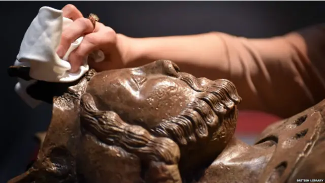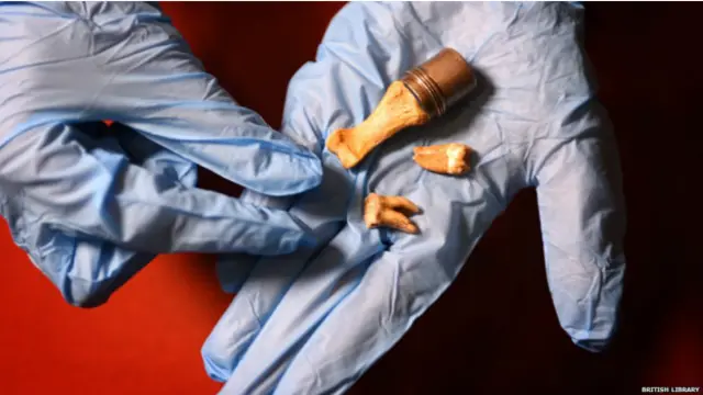 這次展覽也展出中世紀英國國王約翰的兩枚臼齒和一枚拇指骨(下圖),800年前他批准了《大憲章》。這些遺骨與他的遺囑原本和衣服殘片同時展覽。1797年開棺驗證英王約翰埋骨地點時出土。