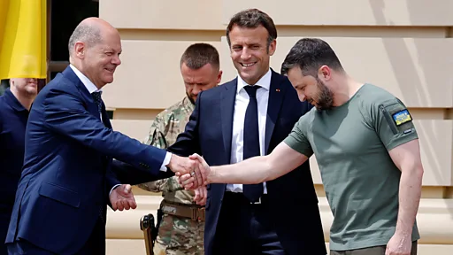 此前,烏克蘭曾批評這歐洲三大國對烏克蘭的的支持過於謹慎。 會見中,法國、德國、意大利和羅馬尼亞領導人都表示支持烏克蘭加入歐盟的申請,稱其應被 「立即 」授予候選國地位。