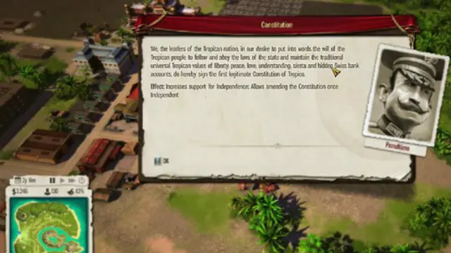 《海島大亨5》將玩家設置成熱帶島嶼的統治者,可以成為虛構國家中有正義感的英雄,也可成為助長腐敗並重新修訂憲法的權力獨裁者。