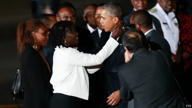 奧巴馬的父親出生在肯尼亞。在機場,他受到肯雅塔總統的迎接,與他握手並擁抱。