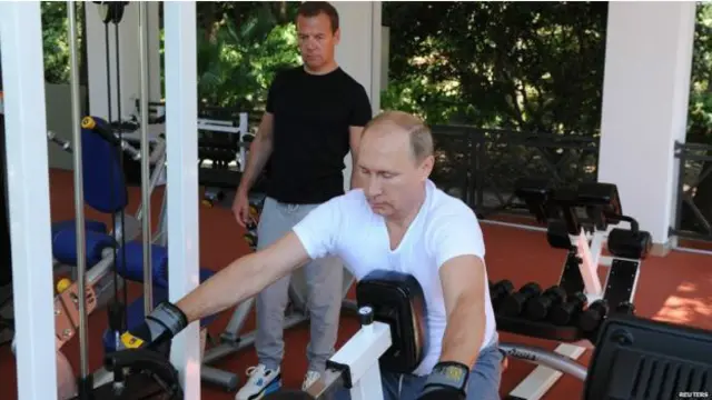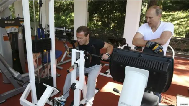 在位於索契的政府官邸內,俄國總統普京和總理梅德韋傑夫一起前往健身房鍛煉。