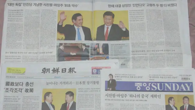 周一(9日)出刊的韓國早報中,包括《朝鮮日報》、《東亞日報》與《首爾新聞》,都直接在頭版放上馬習兩人的會晤照片。《中央日報》與《韓民族新聞》更是罕見地開闢兩大頁的版面,解說兩岸關係。