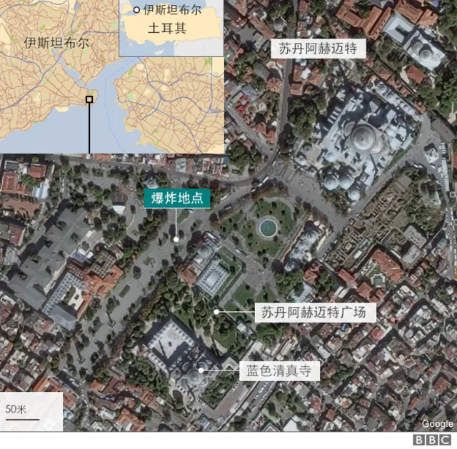土耳其官方說,爆炸發生在伊斯坦布爾市內的著名蘇丹艾哈邁德廣場。